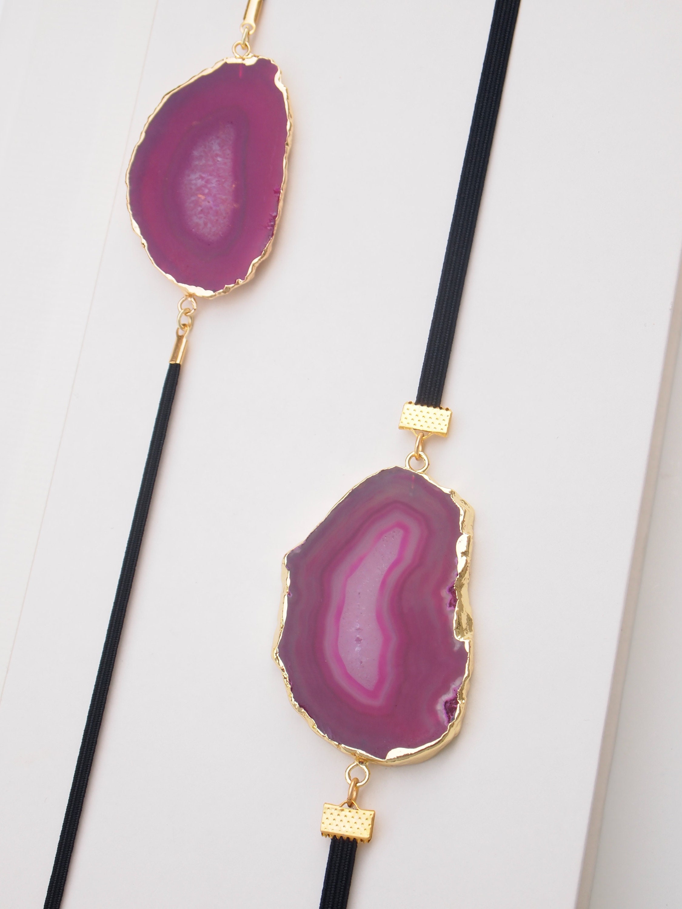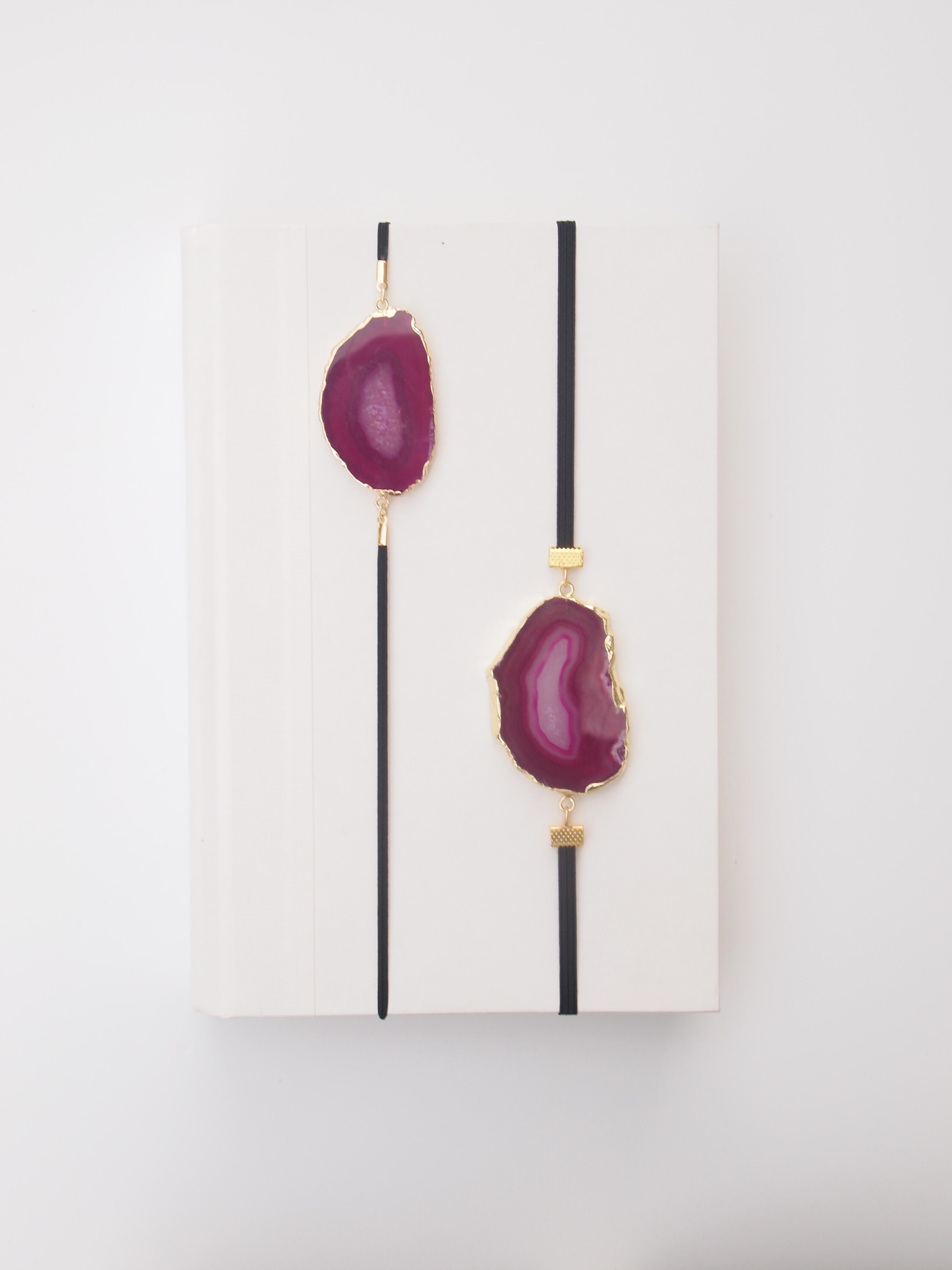 Your choice of very large pink geode slice Artmark. Thin and medium stretch black ribbon. Fitting snugly on nearly any size book, notebook, or planner you can be sure an ArtMark will never fall out and lose your place, no matter where you bring your new read. The soft elastic ribbon ensures your pages will never be torn or folded over. An ArtMark can be worn on the cover of your book or placed on the spine.