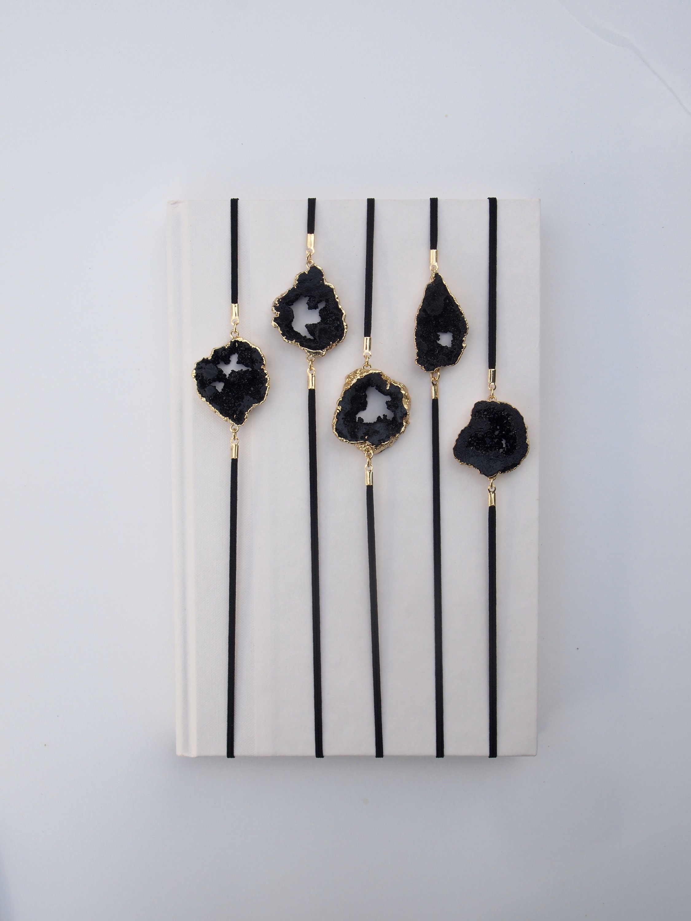 Your choice of black geode connector plated in gold. Thin black stretch ribbon.Listing left from right. Fitting snugly on nearly any size book, notebook, or planner you can be sure an ArtMark will never fall out and lose your place, no matter where you bring your new read. The soft elastic ribbon ensures your pages will never be torn or folded over. ArtMark can be worn on the cover of your book or placed on the spine.