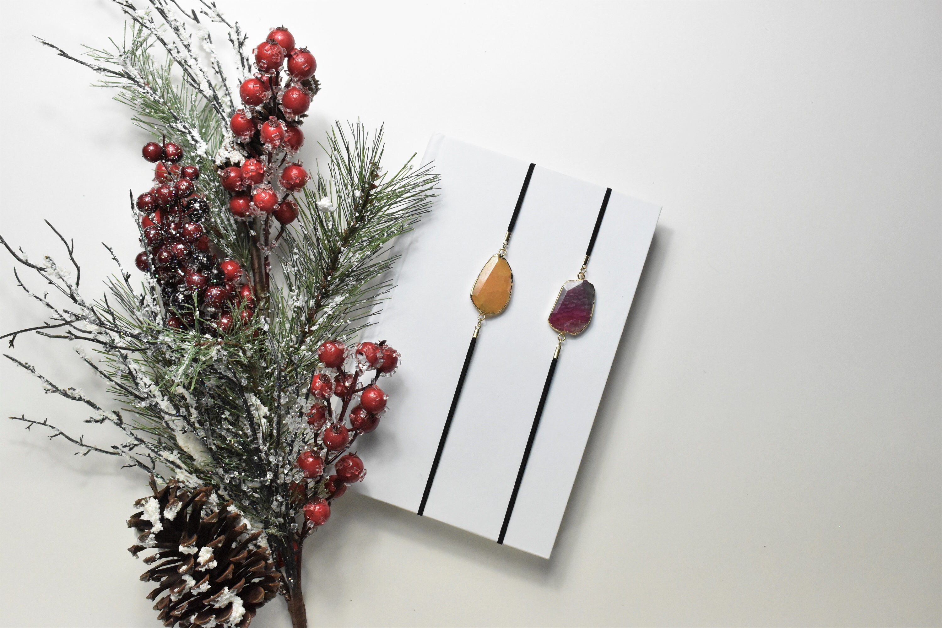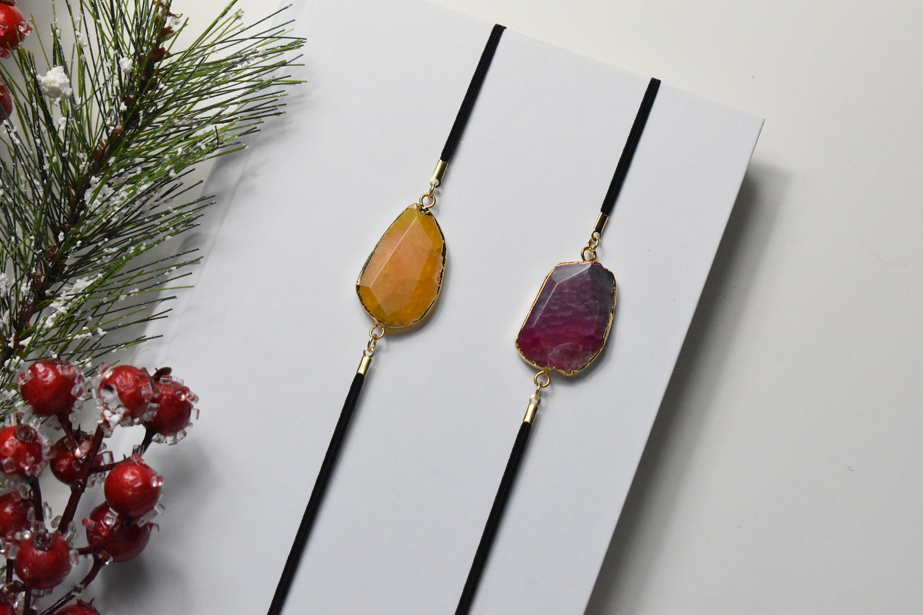 Your choice of geode stone. Thin black stretch ribbon with gold detailing. Fitting snugly on nearly any size book, notebook, or planner you can be sure an Artmark will never fall out and lose your place, no matter where you bring your new read. The soft elastic ribbon ensures your pages will never be torn or folded over. An Artmark can be worn on the cover of your book or placed on the spine.
